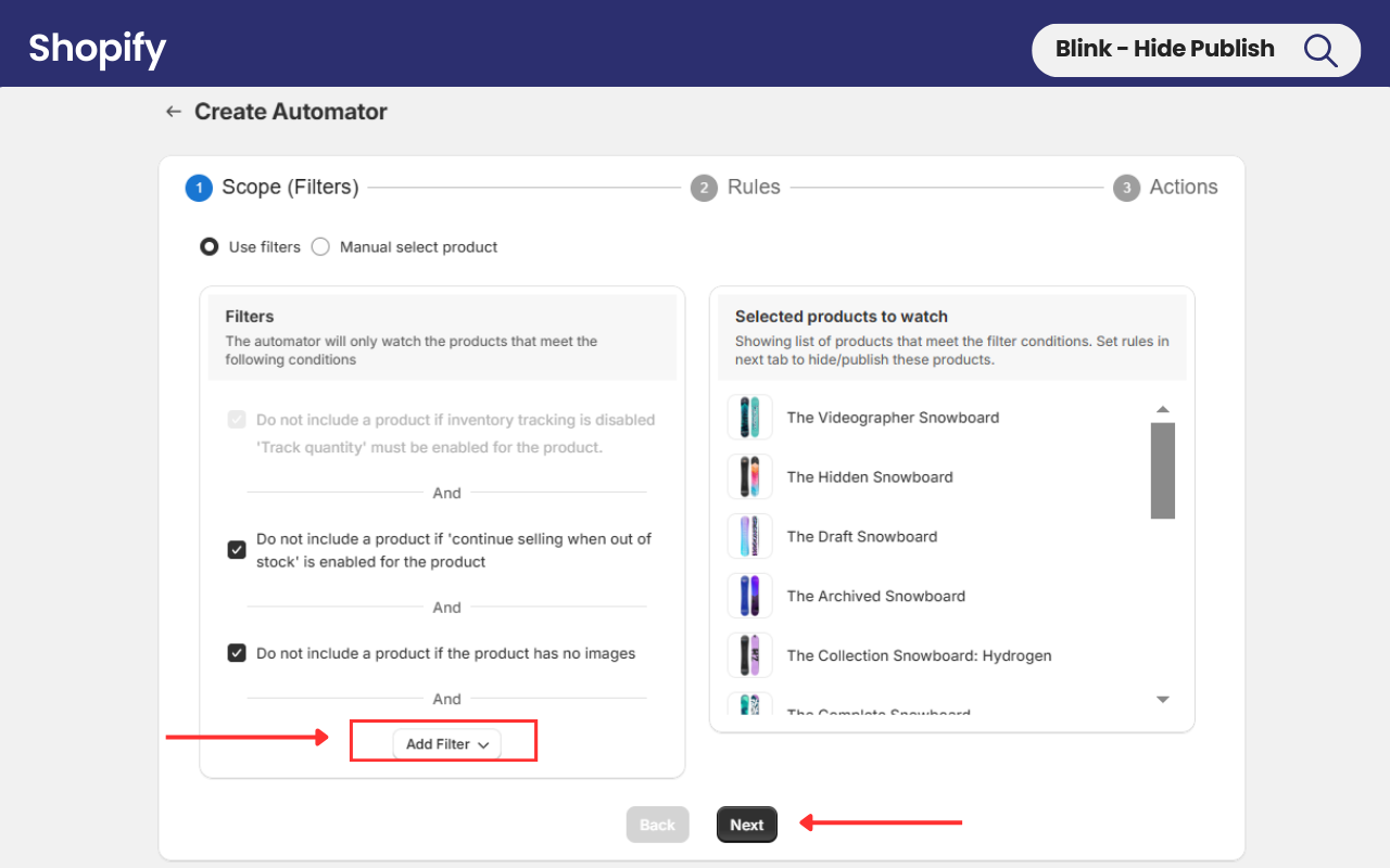 Now, go ahead and choose the preferred filter by clicking on the **Add Filter** option to select products. Alternatively, you can pick products manually by selecting **Manual Select Product**.