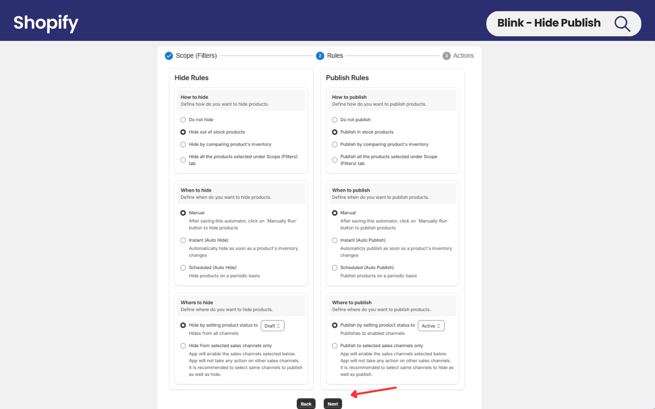 Now, choose the most suitable rules for hiding and publishing your products, depending on what best fits your needs and click **Next**.&#x20;