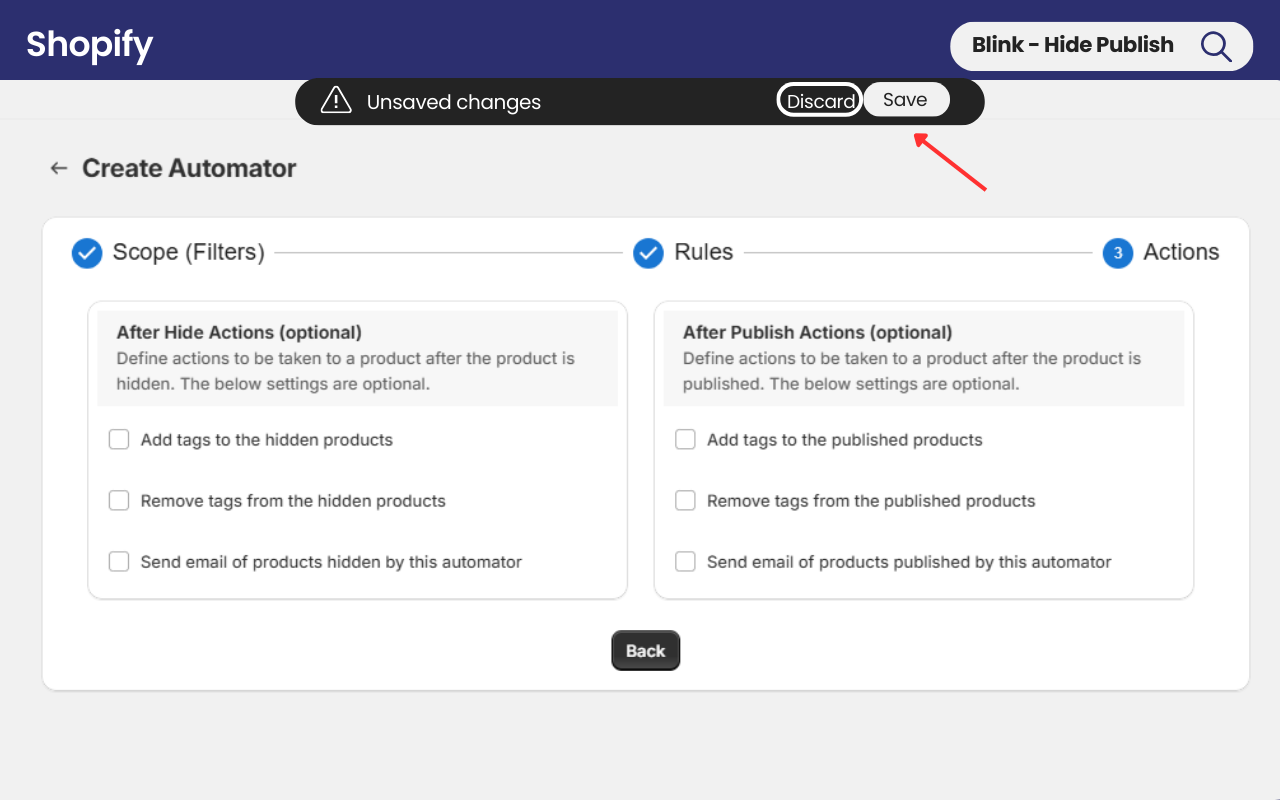You will be directed to the **Actions** section of the Automator. From there, choose your preferred settings for the hidden and published products from the available predefined options, and then click **Save** to create the Automator